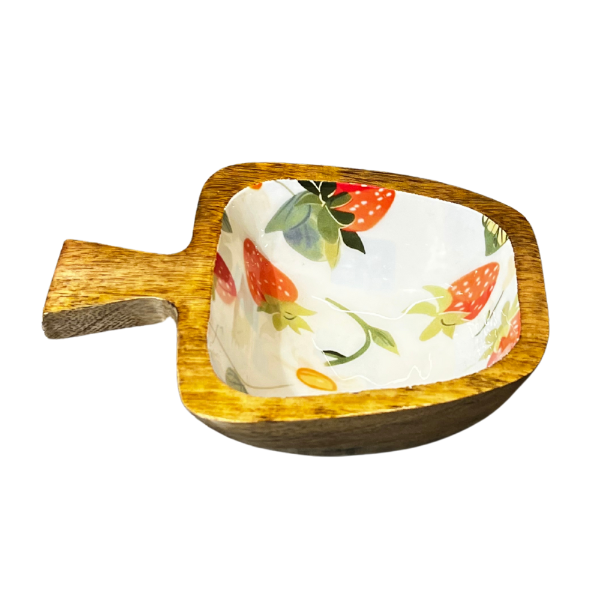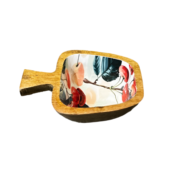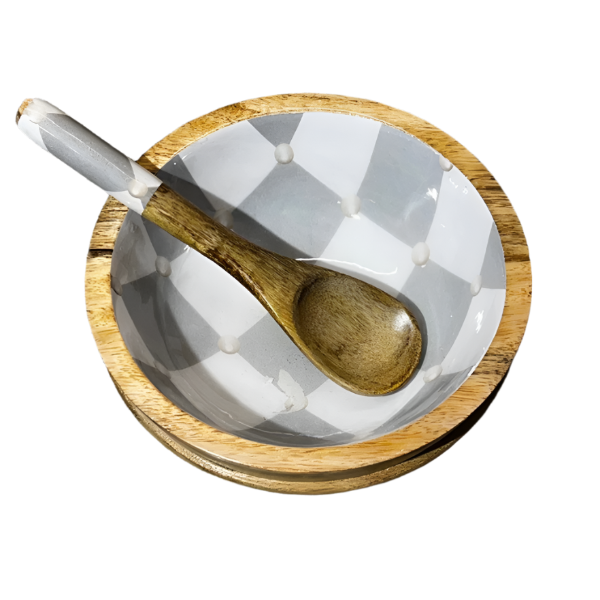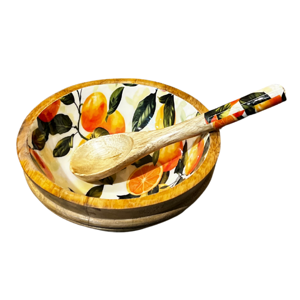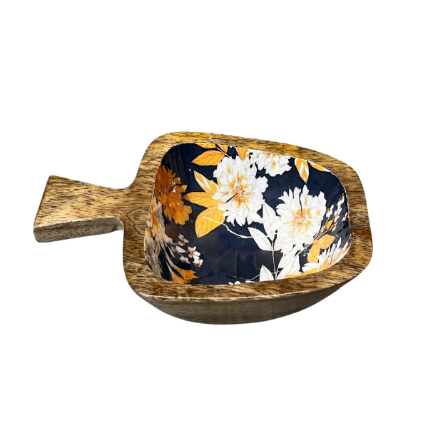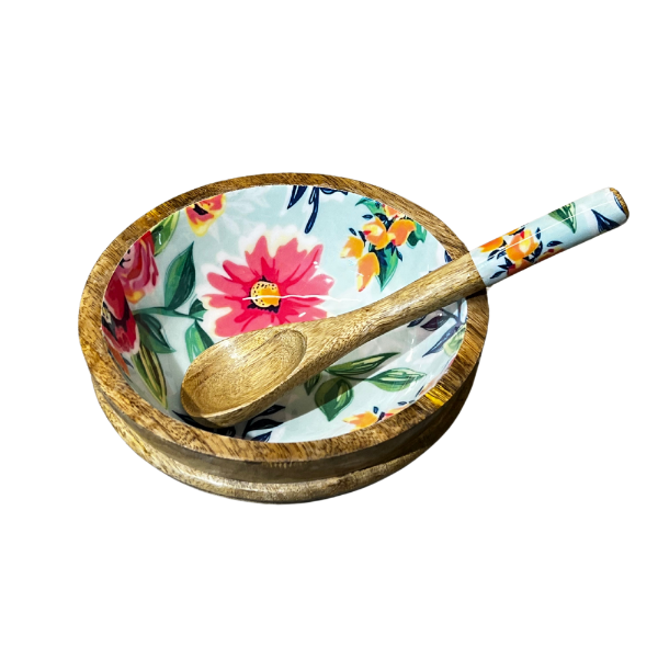 Each bowl is lovingly carved from seasoned mango wood, then finished with a hand-poured Bondtite epoxy resin exterior that features a vibrant, floral motif. Paired with a matching wooden spoon and fork adorned with the same detailing, this is more than a kitchen essential—it's a visual delight.